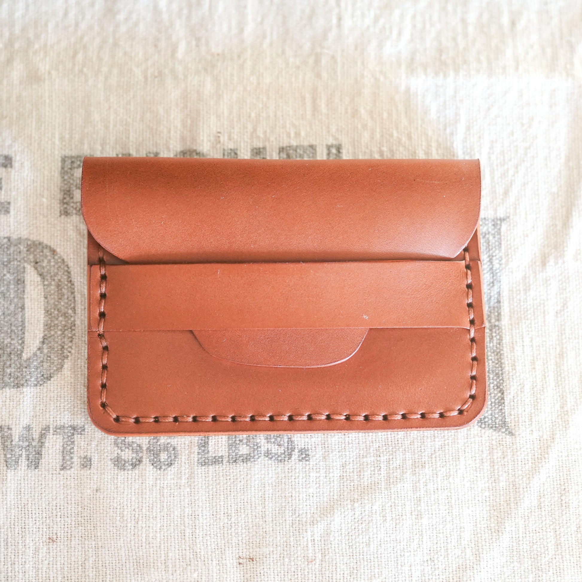 HAND STITCHED LEATHER CARD WALLET MADE FROM A BEAUTIFUL CHESTNUT BRIDLE LEATHER. THIS SIMPLE BUT FUNCTIONAL DESIGN FOR A THOSE THAT CARRY A FEW CARDS AND BILLS.